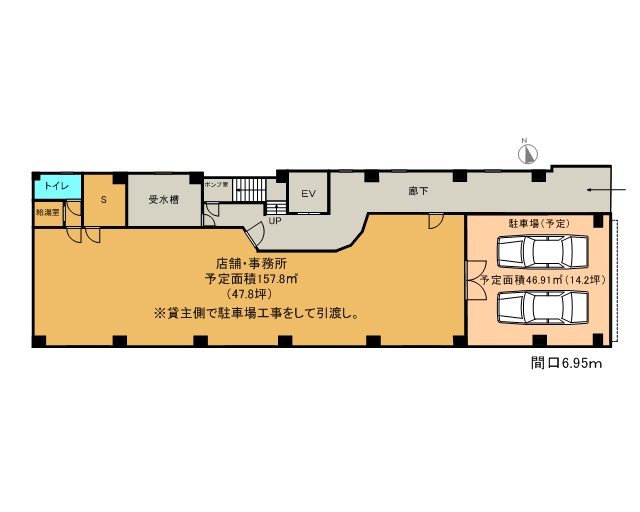 - 貸室東側14坪をピロティー駐車場2台分への変更相談可能。